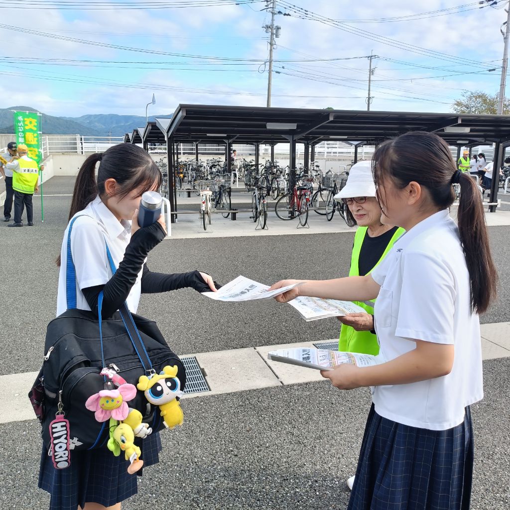今回は秋の交通安全県民運動(9月21日~30日)に合わせて両校の生徒会と神埼町交通安全協会・神埼警察署・神埼市で行い、令和8年4月1日に施行される自転車交通違反「青切符」導入について呼び掛けました。