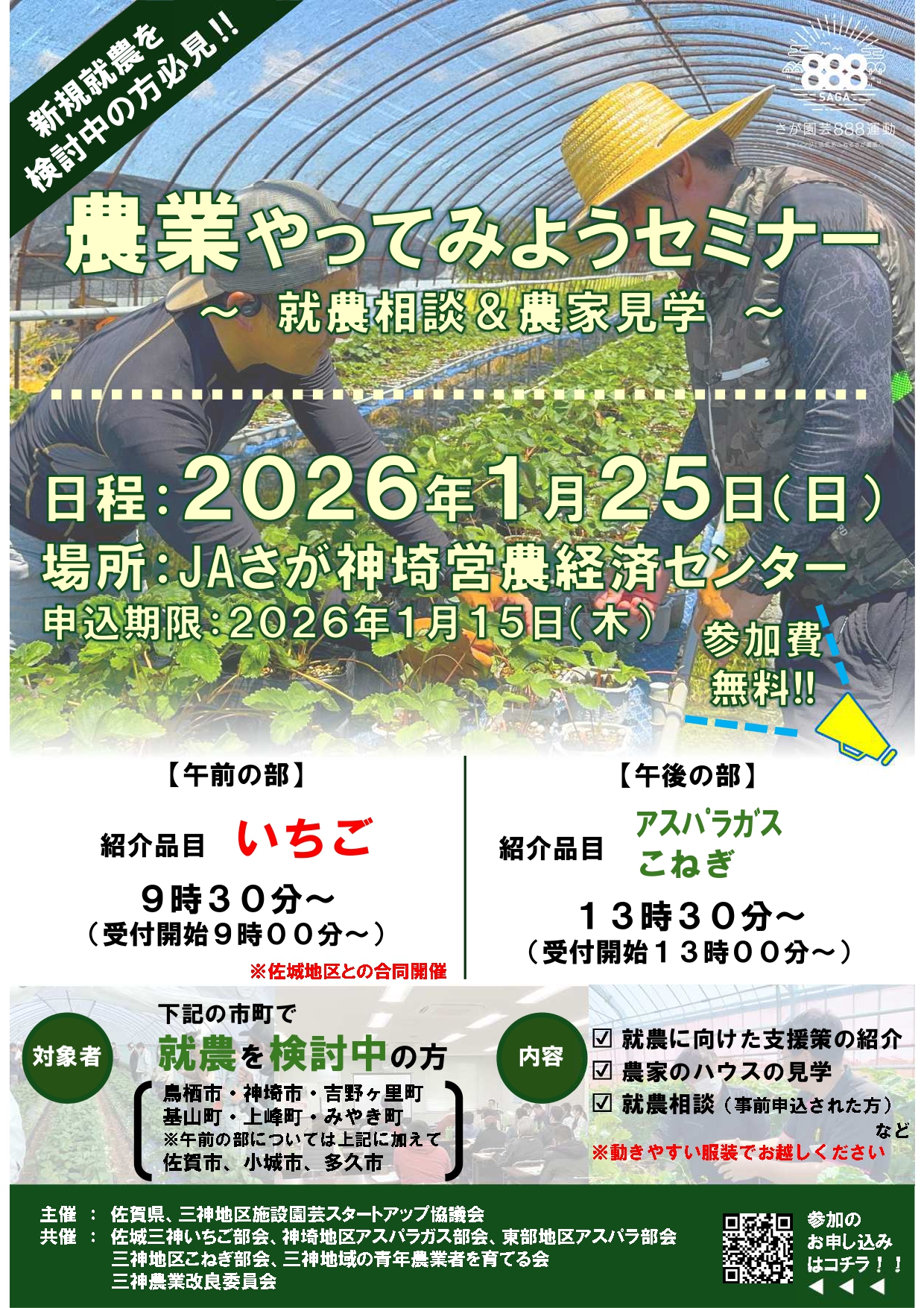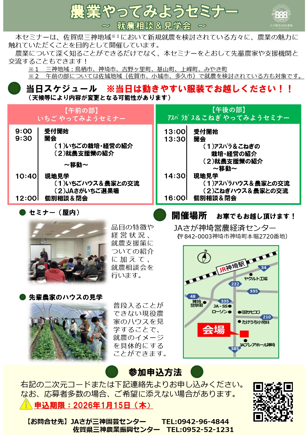 新規就農を目指すみなさんに佐賀県三神地域※の農業の魅力を知ってもらうため、「農業やってみようセミナー」を開催します。